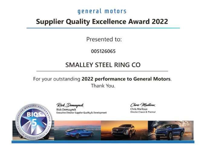 伊利诺伊州苏黎世湖,2023 年 7 月 17 日 – Smalley 高兴地宣布荣获通用汽车颁发的 2022 年供应商杰出质量奖 (SQEA),这也是我们连续 第十一 年获此殊荣。 这一备受推崇的认可证明了 Smalley 坚定不移地致力于在汽车行业提供杰出品质和卓越性能产品的承诺。 通用汽车授予的 (SQEA)供应商质量奖,表彰并承认供应商在生产和交付方面致力于满足并超越严格绩效标准。 Smalley 一贯证明其有能力超越这些标准。 通用汽车公司这一认可进一步巩固了 Smalley 作为汽车行业值得信赖合作伙伴地位。 通用汽车赞扬了 Smalley 杰出表现:“Smalley 是团队重要组成部分,有助于确保我们客户对购买产品感到认可和满意。 我们感谢Smalley在我们持续应对充满挑战环境时,始终如一地为通用汽车制造工厂提供高质量产品。” Smalley 生产经理 Josh Turnbull 表示:“赢得 GM 2022 年供应商杰出质量奖对于 Smalley 是一项令人振奋荣誉。” “这一成就是对我们整个团队辛勤工作、专业知识和不懈奉献认可。我们对Smalley产品感到无比自豪,并感谢能够继续成为通用汽车优选供应商。” ## Smalley 是众所周知高品质弹性挡圈和波簧供应商。 100 多年来,Smalley 一直为包括汽车在内各个行业提供创新解决方案。 Smalley 零件用于从转向系统到变速箱各个领域。 我们新的汽车行业突破性产品睿威Revolox® 自锁挡圈使得工程师能够针对高转速 RPM要求进行设计。 睿威Revolox 挡圈是一种节省成本的解决方案,易于组装,适合大批量应用。 Smalley作为一家具有前瞻性企业, 继续推动创新,同时保持对卓越品质和客户满意度承诺。