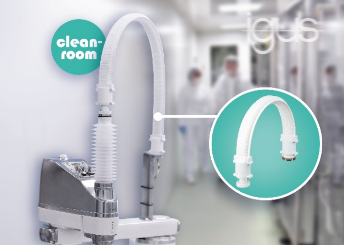 igus为无尘室SCARA机器人应用推出了一款新的供能系统——Clean SCARA无尘拖管解决方案,它由耐磨高性能工程塑料制成,即使在高速应用中也几乎不会产生任何颗粒物或污染物,满足ISO 2级无尘室要求。而且该系统比传统波纹管更坚固,更方便使用。
