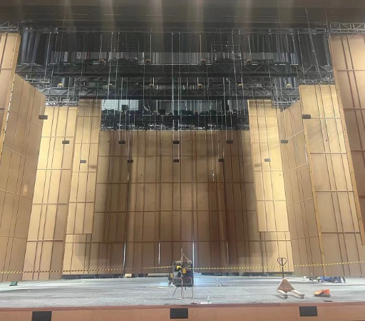 为了让舞台机械能稳定、安全地发挥效能以保证沉浸式效果,上海前滩31文化演艺中心主舞台吊挂设备全部为电动吊杆:可移动灯具吊杆可以灵活选择在不同的位置吊挂在电动吊杆上,电网顶部共有10台盘管(尺寸为长1.7m*宽1.858m*高1.78m),分左右两侧布置5台,分别给5条活动灯杆供电。每个活动电动吊臂上有两套卷线器,通过控制可实现卷取机和悬挂活动灯臂的电动吊臂同步升降平台,误差控制在 2mm 以下。大丰不仅要求升降设备在垂直移动时必须可靠和稳定,而且对于整体电缆导向系统的隐蔽性和高负载能力也特别看重。
