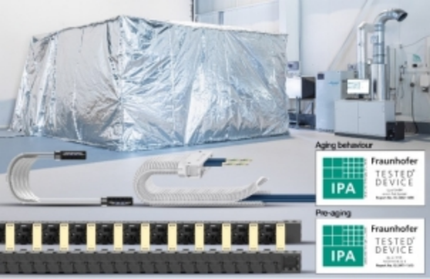 E6、e-skin flat、e-skin soft和easy chain E14系列拖链通过弗劳恩霍夫IPA研究所长期测试,证明了它们在干燥无尘室中的适用性