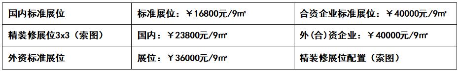 国内标准展位 标准展位:¥16800元/9㎡ 合资企业标准展位:¥40000元/9㎡