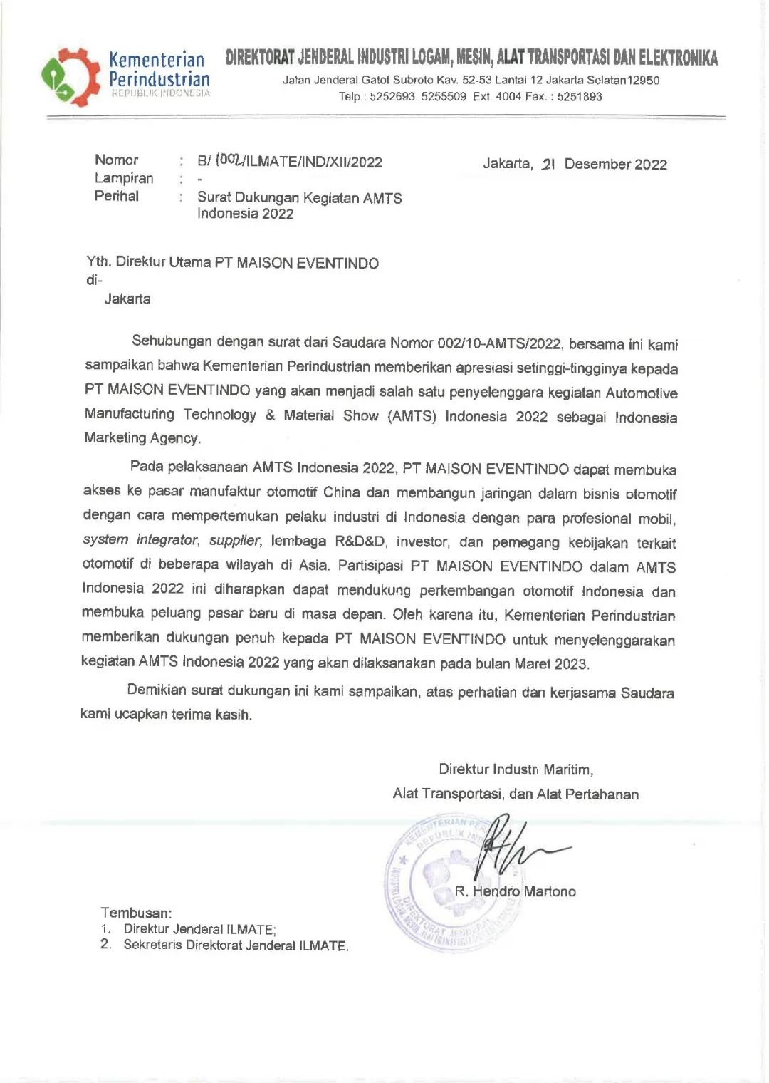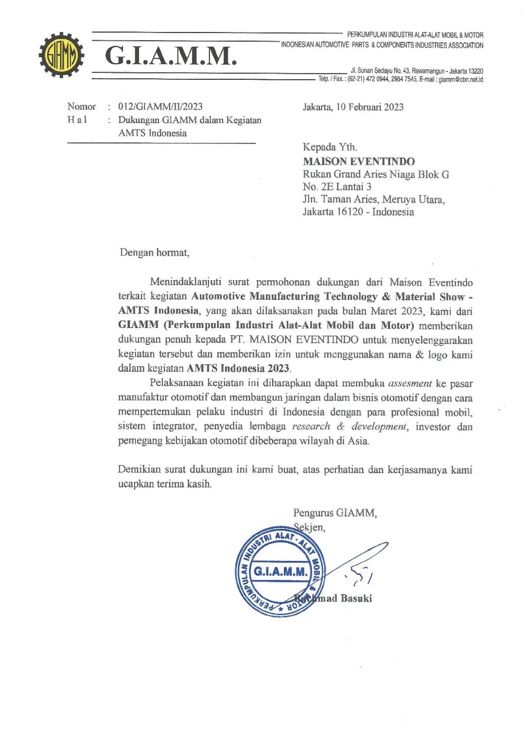 近日,AMTS Indonesia 2023印尼雅加达汽车工程智造论坛(3月14-15日,印尼雅加达会议中心)获得了印尼交通部(Ministry of Transportation of Republic of Indonesia)、印尼工业部(Ministry of Industry of Republic of Indonesia)、印尼电池公司(IBC)、印尼汽车工业协会(GAIKINDO)、印尼汽车零部件工业协会(GIAMM)、印尼焊接协会(IWA)、印尼汽车后市场协会(GATOMI) 等多家印尼当地官方部门、合作方及协会的官方支持函!