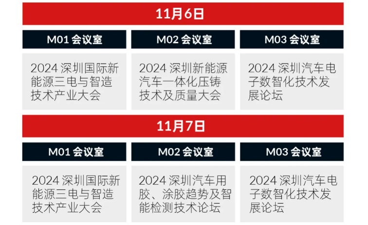 作为中国智造的倡导者与引领者,励进展览就“新能源三电”、“汽车用胶”、“一体化压铸”、“汽车电子”、“智能制造”等时兴议题创办的四场行业会议将于今年11月6日-7日在深圳国际会展中心(宝安新馆)16号馆内,与AMTS & AHTE SOUTH CHINA 2024同期举办,互相激发、共创工业数智化发展的新浪潮。