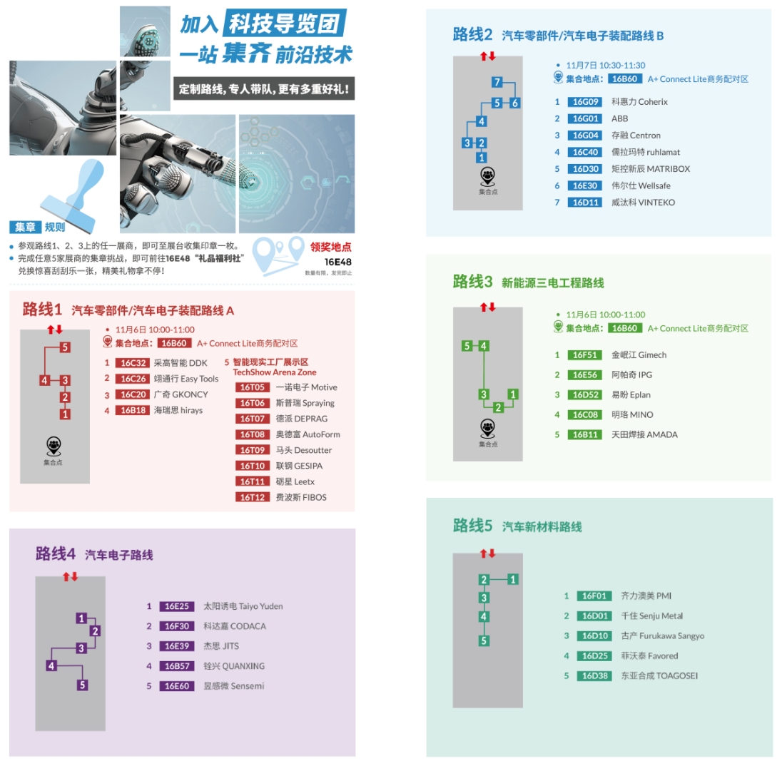 AMTS & AHTE SOUTH CHINA 2024的科技导览团将规划四大主题路线,并由专人带队,直击C位展商。“新能源三电路线”将为观众揭示电池、电机、电控等hth电子竞技俱乐部的新进展;“汽车零部件/汽车电子装配路线”将带领观众深入了解汽车零部件制造与装配的先进技术;“汽车电子路线”将引领探索汽车电子控制系统的创新,“汽车新材料路线”则将聚焦于新型材料在汽车制造中的应用及其所带来的性能提升和创新。