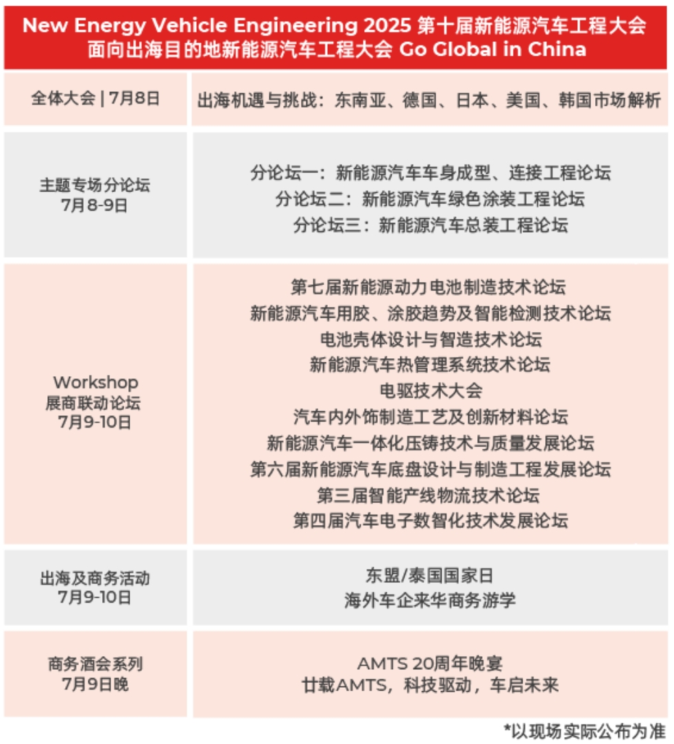 NEV Engineering 2025 第十届新能源汽车工程大会全新出发,打造:面向出海目的地的新能源汽车工程大会,结合主办方励展全球化汽车产业合作资源,预计将吸引4,000名中国及1,000名来自东南亚、日本、韩国、德国、美国、印度及其他海外目的地车企、产业协会园区政府机构等领域的行业精英,共同探讨新能源汽车车身,绿色涂装、总装、三电工程及零部件制造工程领域的hth电子竞技俱乐部、市场趋势、以及出海目的地的政策法规及合作机遇,为行业精英提供一个不出国门即可深度参与的国际交流盛会。