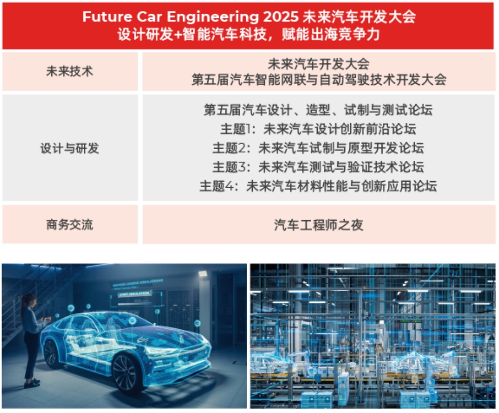Future Car Engineering 2025未来汽车开发大会将聚焦智能网联与自动驾驶技术、汽车设计、造型、试制与测试等核心的hth电子竞技俱乐部与解决方案,汇聚全球汽车设计研发领域的精英,打造一场技术、生态、商业深度融合的国际盛会,预计将吸引1,000名中国及500名来自海外的汽车设计研发人员。
