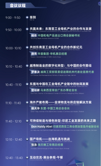 ·超重磅嘉宾:中国机电产品进出口商会副秘书长杨彤、越南工贸部首席代表罗春决、马来西亚商会广东办事处会长管裕新、东盟·中国工商总会会长杨天华、印度尼西亚工商会西加里曼丹省副会长Don Haidy Abel、华墨集团·华机展总经理唐南、海天精工华南总经理张浩。