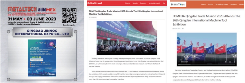 同时金诺会展积极与马来西亚机器厂商总会、马来西亚中华总商会、马来西亚中国总商会、马来西亚礼品商会、吉隆坡暨雪兰莪中华印务商工会、马来西亚印刷商工会、马来西亚橡胶手套生产商协会、马来西亚电业公会、亚洲国际贸易投资商会等十余家海外行业权威组织进行接洽磋商,成功签署代理合作协议及多方面合作意向,广邀海外行业精英,莅临青岛国际机床展参展参观,开拓国际市场商机。